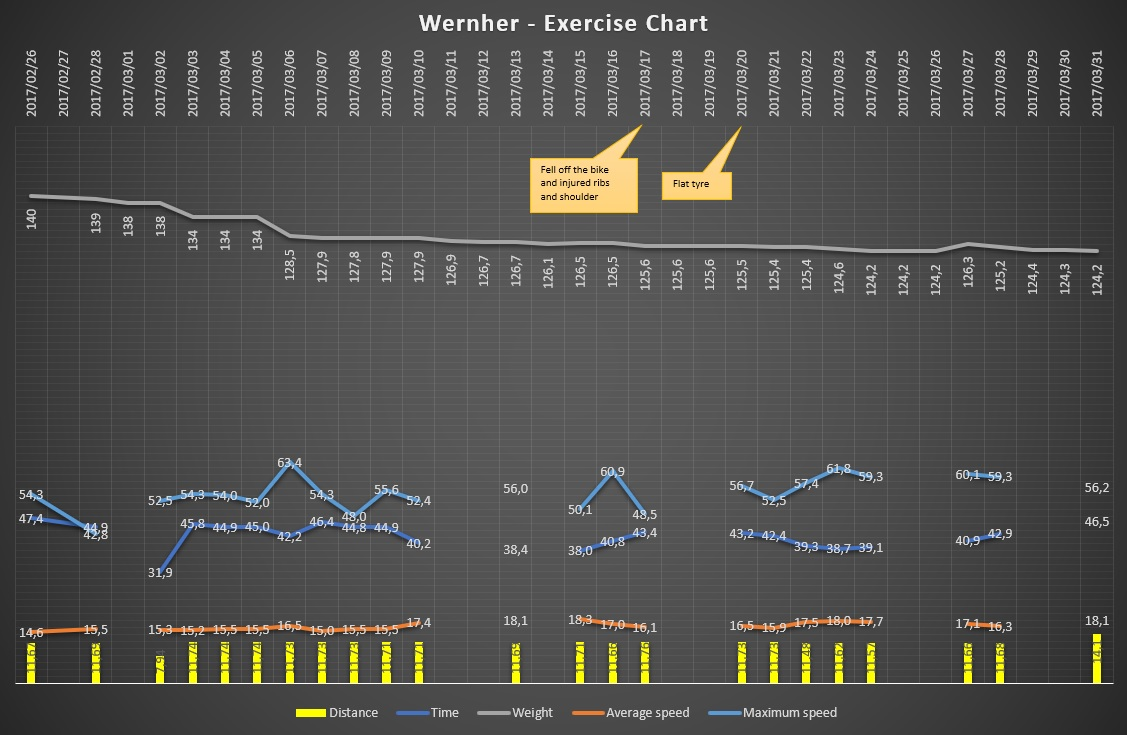 With the diet that my brother and I discussed and agreed on and the bicycle, I started my first bike ride in approximately thirty years, with my son as a companion. My first trip was a mere 7,9 kilometers and I didn’t record it as I didn’t think of doing it. Only at around the third ride did I get around to start recording. The attached graph shows my progress in terms of performance and weight loss in the first month, starting with my first recording on 26 February 2016.